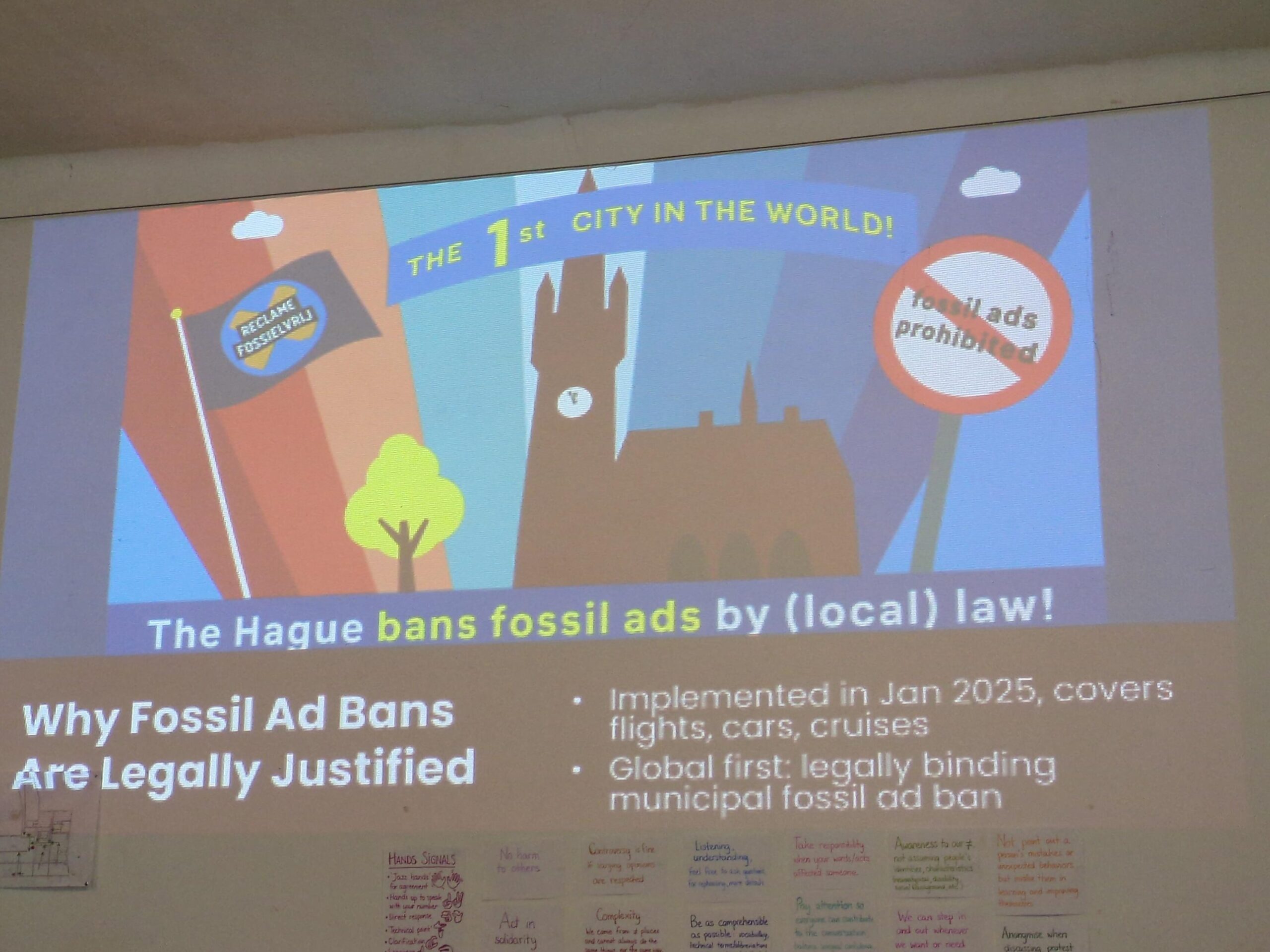 Organisationen oder NGOs wie Fossielvrij NL oder Cittadini Sostenibili zeichnen sich durch ihre lokale politische Arbeit aus, die Stellschrauben im rechtlichen Rahmen des politischen Systems sucht. In seinem Vortrag am Samstag berichtete Andrea von Cittadini Sostenibili über die Erfolge und folgende Vorgehensweise seiner Organisation: Lokalen Politiker:innen mundgerecht kleine Gesetzesanpassungen servieren, die durch Druck über Pressearbeit sowie persönliche Treffen mit zugeschnittenen Argumente, warum weniger fossile Werbung gut sei, schmackhaft gemacht werden. Gerade dieser lokale Ansatz schafft Verbote von fossiler Werbung ohne die Öllobby auf den Plan zurufen. Somit könne lawinenartig immer mehr Erfolge und Druck aufgebaut werden. (siehe hier für Erfolge: https://www.worldwithoutfossilads.org/)