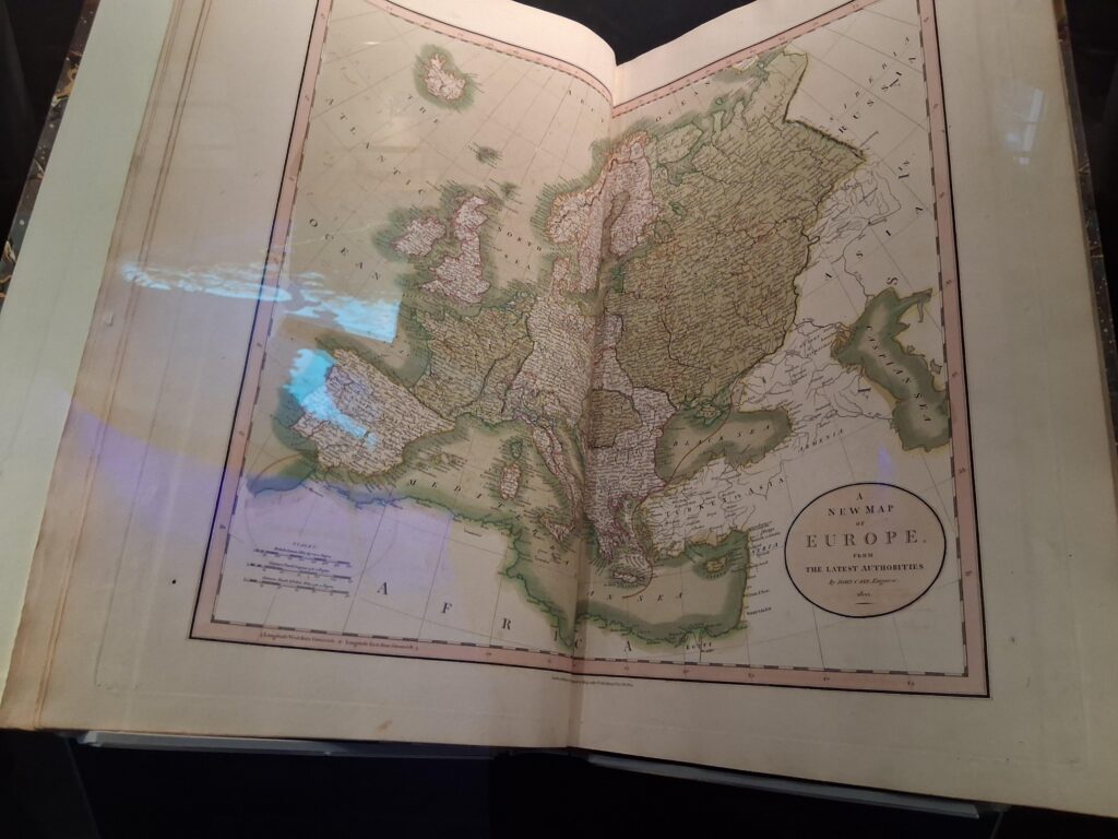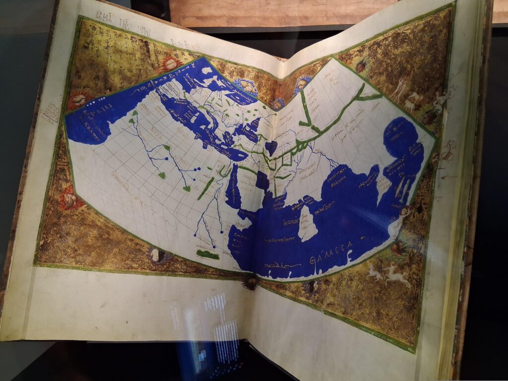 Im Rahmen des Berichts möchte ich aber unabhängig davon noch einmal auf einen eigenen kleinen Kritikpunkt eingehen, der mir relativ am Anfang der Ausstellung aufgefallen ist. Wir kamen an einen Teil der Ausstellung, wo eine Reihe von Karten aufgereiht war, die Europa und die Welt im Laufe der Zeit und über verschiedene Kulturen hinweg zeigt. Hier war Platz für eine große Diversität an Karten, sogar eine „Witzkarte“, in der die Nord-Süd-Verhältnisse umgedreht und Australien „on top of the world“ gezeigt wird, um den endlosen Down-Under Witzen zu entgehen und ihre Dominanz zu bekräftigen.