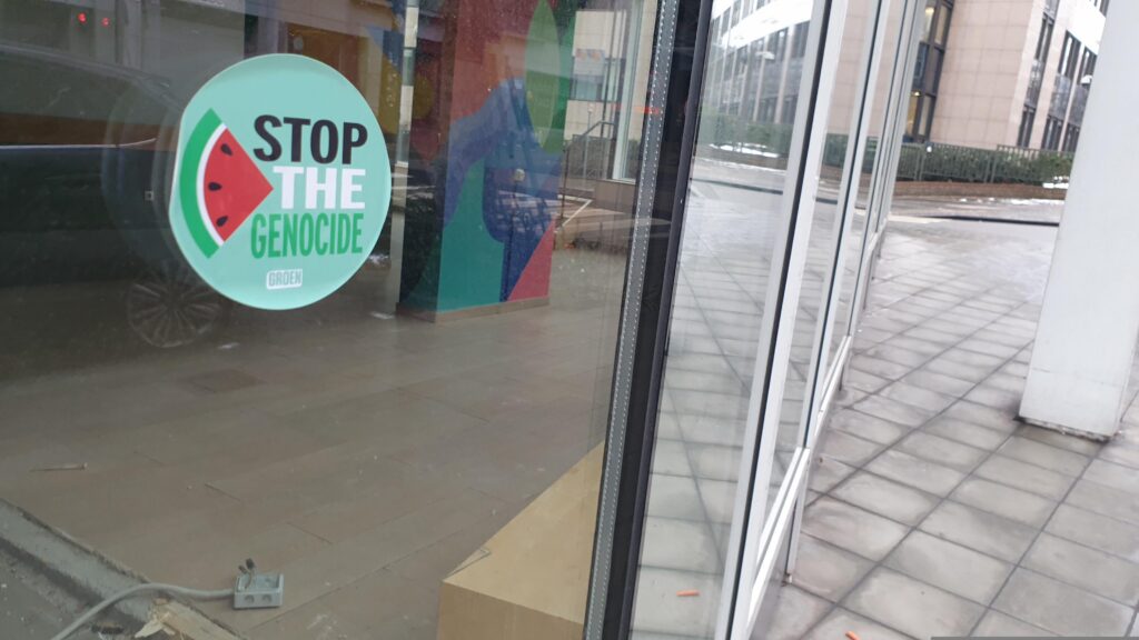 Auf nach Brüssel die EU Institutionen besser kennen lernen! Auf dem Weg durch Brüssel fällt auf, dass die Graffiti und politische Sticker Landschaft in Bezug auf Gaza einseitiger ist als in Berlin. Und wir lernen: auch wir sind manchmal Touris, die staunend durch eine neue Stadt laufen: