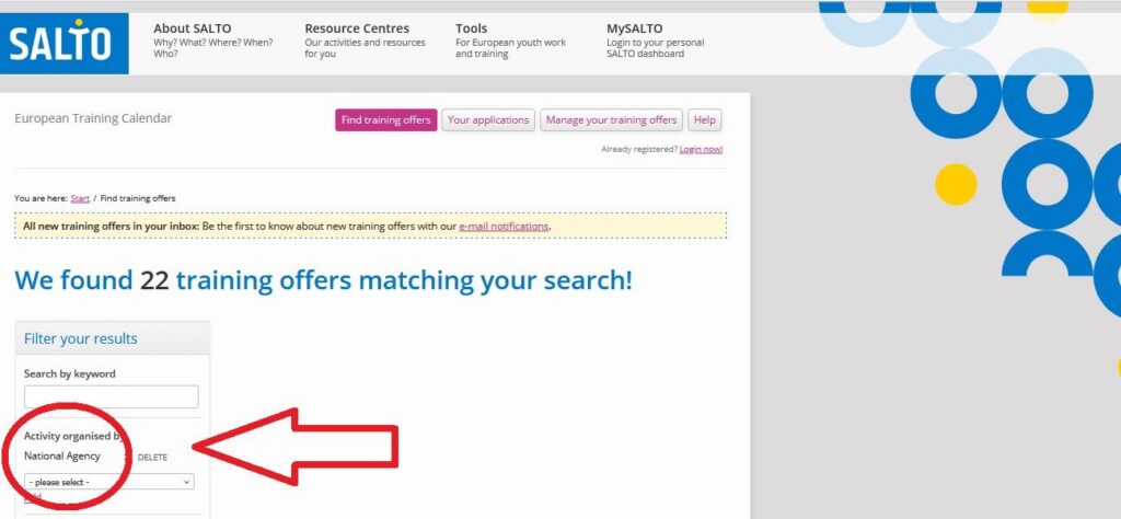 On the SALTO website, you’ll find a search function. Here you can filter your results to show only the training courses offered by the National Agencies. This will give you a quick overview!