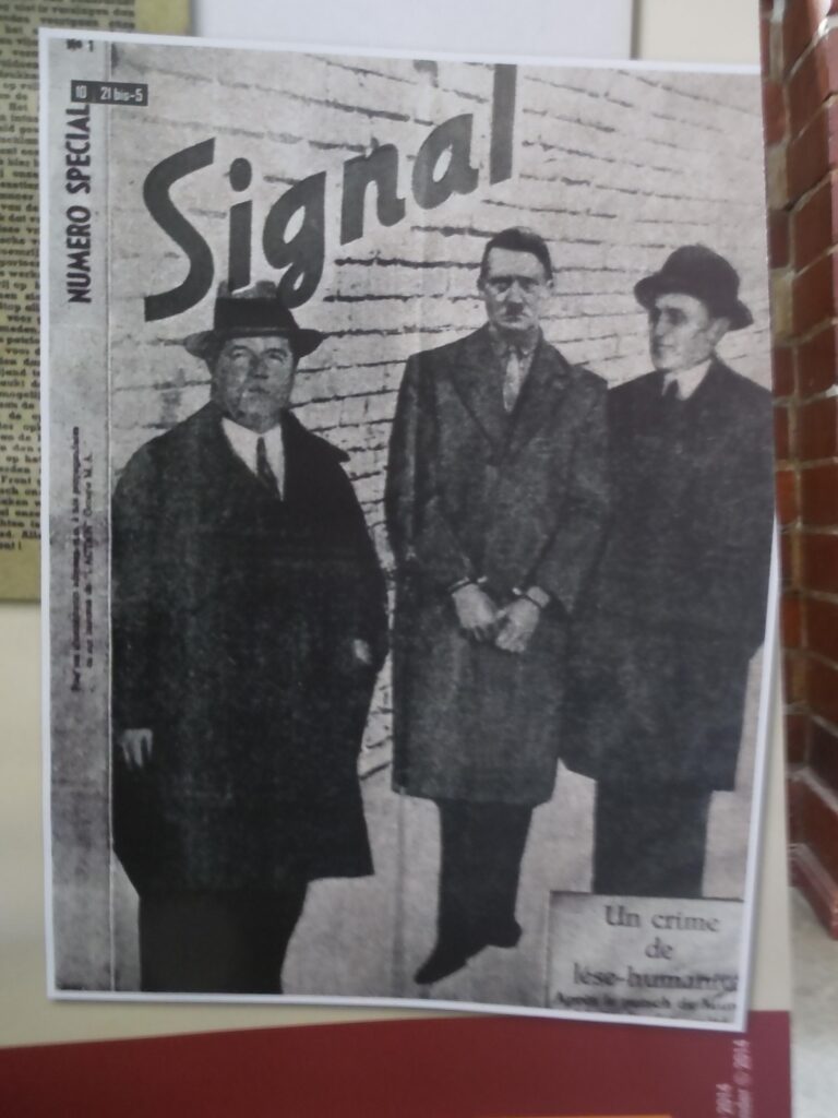 1943 sabotierte der belgische Widerstand mittels sozialistischer Gewerkschaftler*innen bei der belgischen Post die Verschickung der Signal und schleuste stattdessen eine gefälschte Ausgabe in die Distribution. Die Fälschung von damals folgt bereits dem Prinzip, dass so eine Zeitung nur gute Nachrichten enthält. So zeigt das Titelbild zwar wie gewöhnlich den kleinen Deutschen mit dem noch kleineren Bart. Doch dieser trägt bereits Handschellen. Leider scheiterte die Verteilung und die Aktion wurde kein Erfolg.