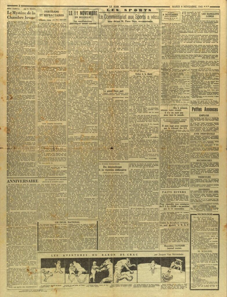 Weniger subtil ging es im Kleingedruckten zu. Der Anzeigenteil zog mit Galgenhumor über den Alltag her: Die Zeitung verkündete, dass am Tag des Waffenstillstandes die Brotrationen auf 500 Gramm hoch gesetzt würden. Die Zeitung enthielt Nachrufe auf Kollaborateure aus der Redaktion des echten „Soir“. Voller Spott ist auch das Kinoprogramm. Angeblich laufen Filme wie „OLYMPIADE – Teil 1: Der Marathon von El Alamein nach Sidi Barani“ und „OLYMPIADE – Teil 2“, der Marathon von Sidi Barani bis zur Küste“ mit Feldmarschall Rommel in einer „maßgeschneiderten Rolle“. Außerdem im Programm: „The UNSINKABLE“; in der Hauptrolle: „Die gesamte britischen Marine“.